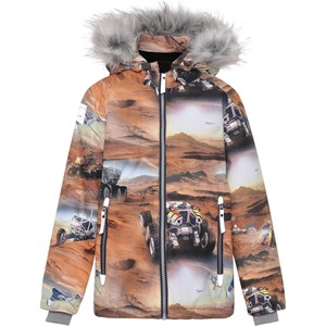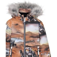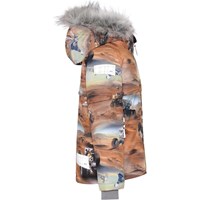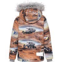 Castor is een bruine gevoerde en waterdichte winterjas met een print van Mars. De jas heeft een afneembare capuchon, een verborgen ritssluiting met overslag, verborgen zakken, zichtbare reflectoren aan de zijkanten van de mouwen en op de achterkant. De jas is gemaakt van een ademende en wind- en waterdichte stof en de voering en tussenvoering zijn gemaakt van gerecycled polyester. Dit product heeft een waterbestendige, PFC-vrije oppervlaktebehandeling (bevat bijvoorbeeld geen PFOS, PFOA, enz.). Waterkolomdruk: 15.000 mm. ademend: 15.000 g / m2 / 24 uur. Het heeft klittenband voor bretels die kunnen worden gekocht.