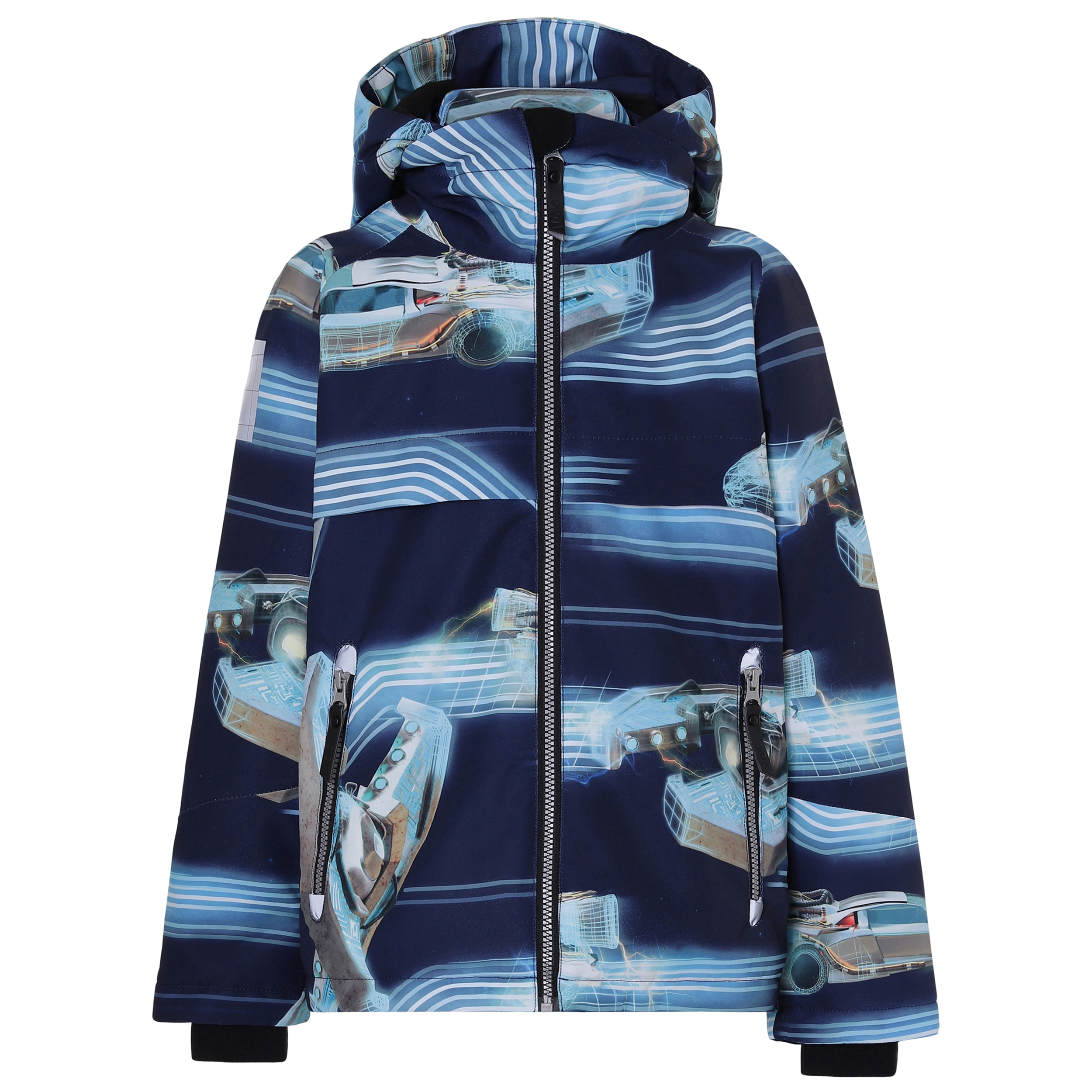 Castor is een gevoerde en waterdichte winterjas met een print van futuristische tijdmachines. De jas heeft een afneembare capuchon, een verborgen rits met knoopsluiting, verborgen zakken, Molo's iconische sterreflector aan de achterkant en elastiek aan de mouwen en onderkant. De jas is gemaakt van een wind- en waterdichte kwaliteit die ademend is. Het is gevoerd met 3M ™ Thinsulate ™ en heeft hoogwaardig fleece op kwetsbare plaatsen en getapete naden. Dit product heeft een waterbestendige, PFC-vrije oppervlaktebehandeling (bevat geen PFOS, PFOA, enz.). De waterkolomdruk en het ademend vermogen zijn verbeterd en zijn nu 15.000 mm voor de waterkolomdruk en het ademend vermogen: 15.000 g / m2 / 24 uur.