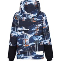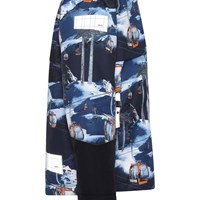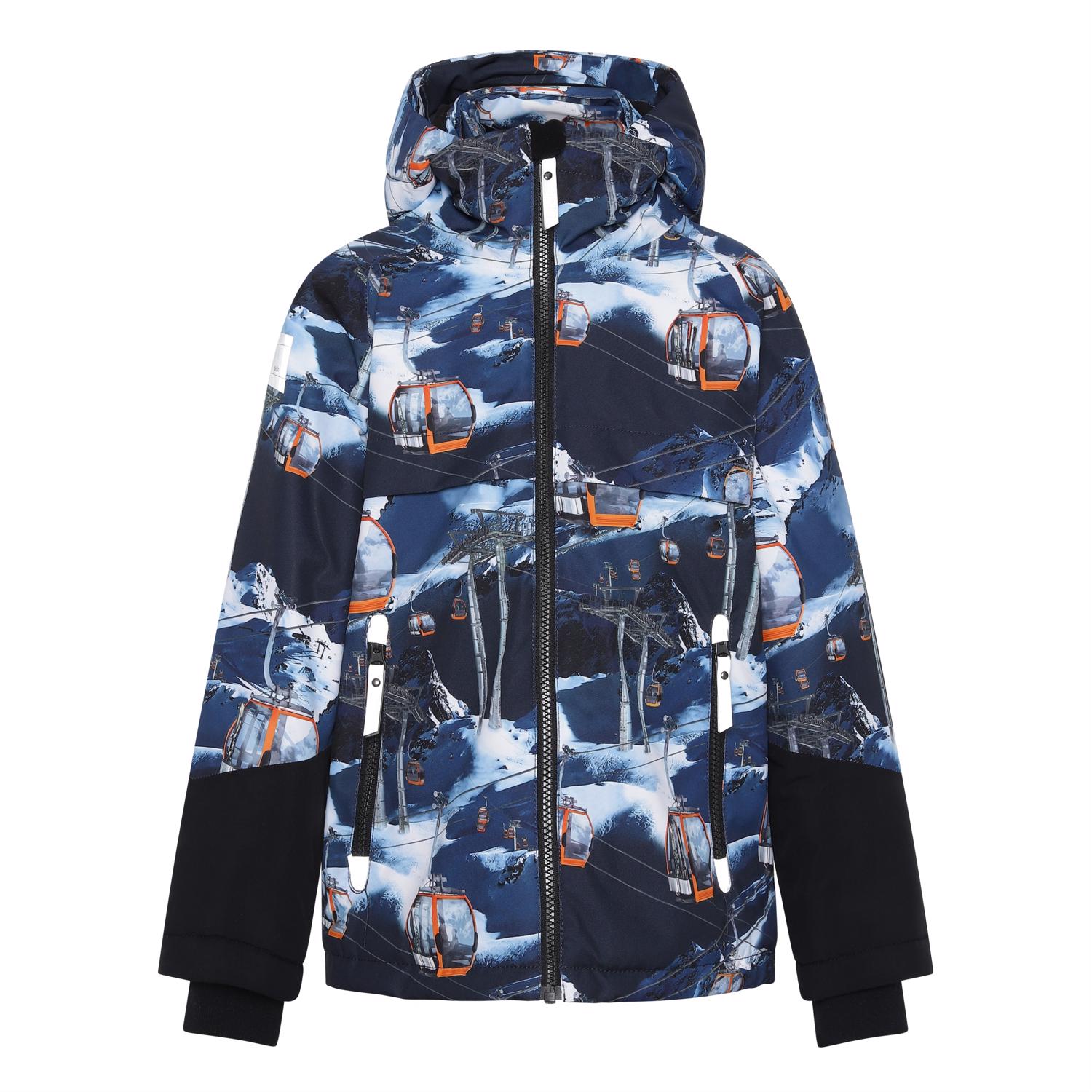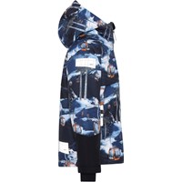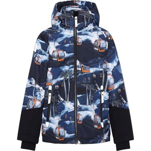 Castor is een blauwe gevoerde en waterdichte winterjas met een print van skiliften. De jas heeft een afneembare capuchon, een verborgen ritssluiting met overslag, verborgen zakken en zichtbare reflectoren aan de zijkanten van de mouwen en op de achterkant. De jas is gemaakt van een ademende en wind- en waterdichte stof en de voering en tussenvoering zijn gemaakt van gerecycled polyester. Dit product heeft een waterafstotende, PFC-vrije oppervlaktebehandeling (bevat geen PFOS, PFOA, enz.). Waterkolom druk: 15.000 mm ademend: 15.000 g / m2 / 24 uur Het heeft klittenband voor bretels die kunnen worden gekocht.