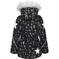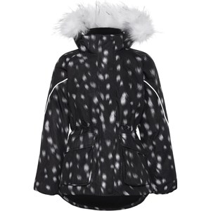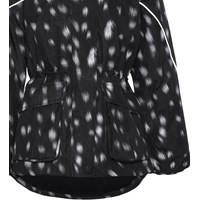 Cathy Fur is een zwarte waterdichte winterjas met witte vlekken die lijken op de huis van een hert. Het heeft een afneembare capuchon met een afneembare boord van imitatiebont, een ritssluiting aan de voorkant, ruime zakken, een verstelbare elastische tailleband en Molo's iconische sterreflector op de achterkant. De jas is gemaakt van een ademende en wind- en waterdichte stof en de voering en tussenvoering zijn gemaakt van gerecycled polyester. Dit product heeft een waterbestendige, PFC-vrije oppervlaktebehandeling (bevat bv. geen PFOS, PFOA, enz.). Waterkolomdruk: 15.000 mm. ademend: 15.000 g / m2 / 24 uur. Het heeft klittenband voor bretels die kunnen worden gekocht.