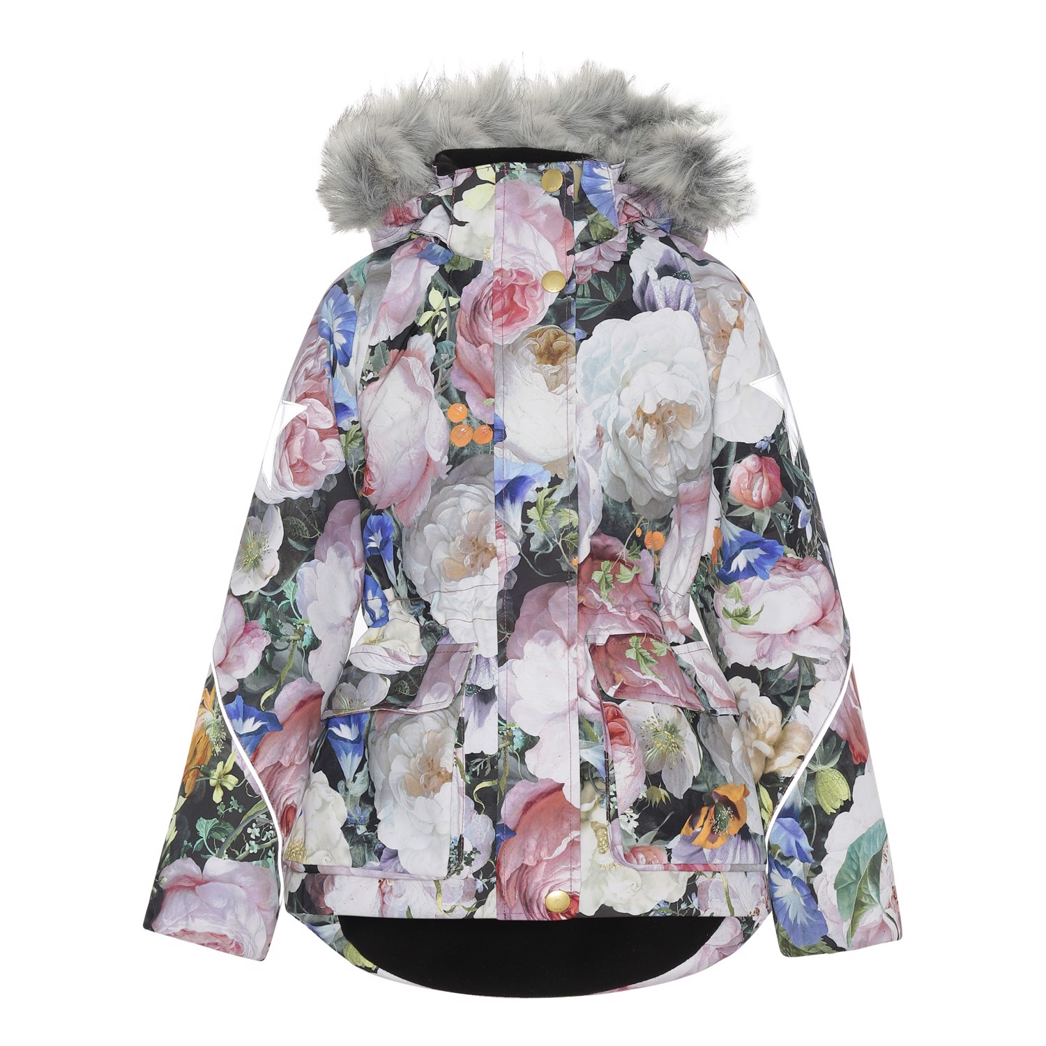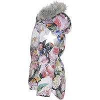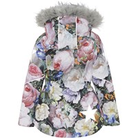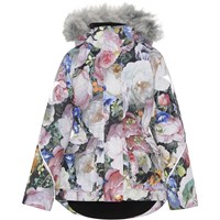 Cathy Fur is een waterdichte winterjas met een bloemenprint. Cathy Fur is perfect voor extreem koude dagen maar ook voor gewone winterdagen. Het hoge ademende vermogen helpt bij het reguleren van de lichaamstemperatuur van het kind, zodat het niet te koud of oververhit raakt. Op warmere winterdagen kan het kind de jas met een dunne onderlaag dragen en op extreem koude dagen kan hij of zij een extra laag aantrekken. Cathy Fur is ook een goede keuze voor minder actieve momenten.De jas heeft een afneembare capuchon met rand van imitatiebont (ook afneembaar), een ritssluiting aan de voorkant, ruime zakken, verstelbare elastische taille en Molo's iconische sterreflectoren op de achterkant. De jas is gemaakt van wind-, waterdichte en ademende materialen. De buitenstof is gemaakt van 45% gerecycled polyester, de 3M™ Thinsulate™ voering is gemaakt van 78% gerecycled polyester en de binnenstof is gemaakt van 100% gerecycled polyester. Dit product heeft een waterbestendige, PFC-vrije oppervlaktebehandeling (Bevat bijvoorbeeld geen PFOS, PFOA, etc). Waterkolomdruk: 15.000 mm. Ademend: 15.000 g/m2/24u