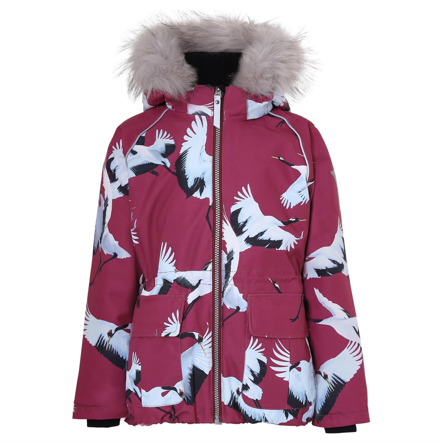 Cathy Fur is een bordeaux rode waterdichte winterjas met print van vliegende kraanvogels. Het heeft een afneembare capuchon met een nep bontrand die ook afneembaar is, een ritssluiting aan de voorkant, ruime zakken, een verstelbare elastische taille en Molo's iconische sterreflector op de achterkant. De jas is gemaakt van een winddichte, waterdichte en ademende kwaliteit en heeft 3M ™ Thinsulate ™. Het heeft een hoogwaardig fleece op kwetsbare plaatsen en getapete naden. Dit product heeft een waterbestendige, PFC-vrije oppervlaktebehandeling (bevat geen PFOS, PFOA, enz.). De waterkolomdruk en het ademend vermogen zijn verbeterd en zijn nu 15.000 mm voor de waterkolomdruk en het ademend vermogen: 15.000 g / m2 / 24 uur.