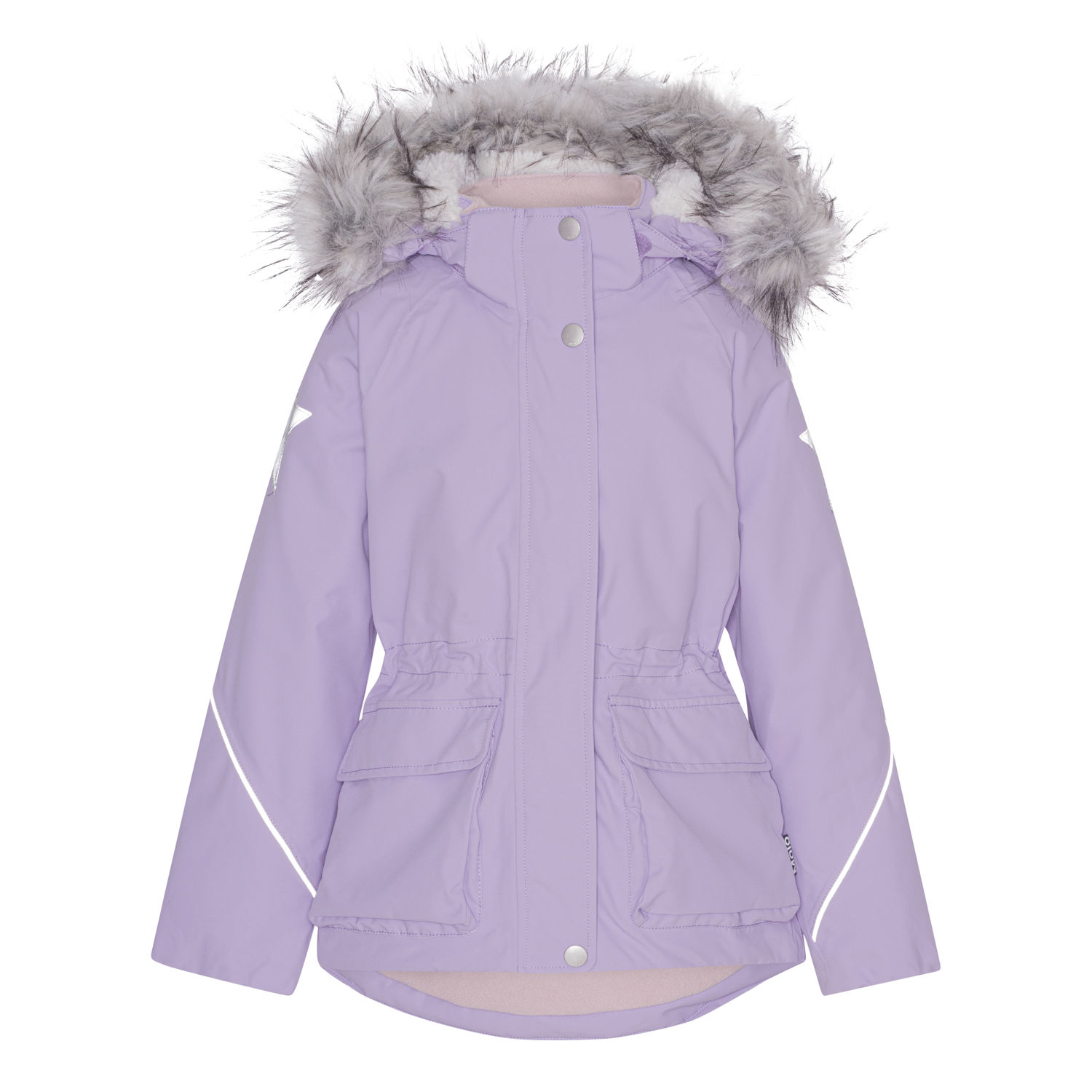 Reflecterende biezen en Molo's iconische sterreflectoren op de achterkant van beide mouwen en op de achterkant van de jas.