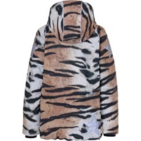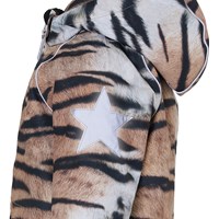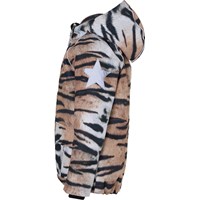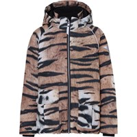 Cathy is een waterdichte winterjas met tijgerprint. Het heeft een afneembare capuchon, een ritssluiting aan de voorkant, ruime zakken, een verstelbare elastische tailleband en Molo's iconische sterreflector op de achterkant. De jas is gemaakt van een winddichte, waterdichte en ademende kwaliteit en heeft 3M ™ Thinsulate ™. Het heeft een hoogwaardig fleece op kwetsbare plaatsen en getapete naden. Dit product heeft een waterbestendige, PFC-vrije oppervlaktebehandeling (bevat geen PFOS, PFOA, enz.). De waterkolomdruk en het ademend vermogen zijn verbeterd en zijn nu 15.000 mm voor de waterkolomdruk en het ademend vermogen: 15.000 g / m2 / 24 uur.