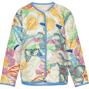 Lichtgele doorgestikte jasje met een kleurrijke print van artistieke bladeren en silhouetten van bloemen. De jas heeft lichtblauwe boorden en drukknopen aan de voorkant. Het is behandeld met een water- en vuilafstotende coating die geen chemicaliën zoals PFOS, PFOA etc. bevat.