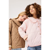 Bruine waterafstotende thermische jas van gerecycled nylon met doorgestikt patroon en afneembare ruchekraag. De jas heeft een normale pasvorm, steekzakken, knoopsluiting aan de voorkant en bijpassende biaisband, wat zorgt voor een mooie afwerking.
