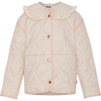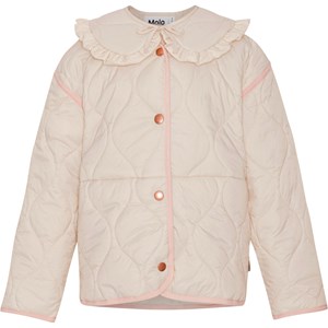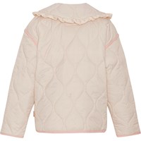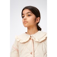 Beige doorgestikte jas met een brede en afneembare kraag met ruches. De jas heeft lichtroze boorden en een knoopsluiting aan de voorkant. Het is behandeld met een water- en vuilafstotende coating die geen chemicaliën zoals PFOS, PFOA etc. bevat.