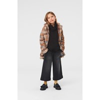 Haili is een zachte imitatie bontjas in beige met bruine en lichtblauwe blokken. De kraag kan omhoog of omlaag worden geklapt. Het heeft een drukknoop sluiting.