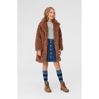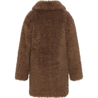 Haili is een zachte bruine teddy jas. De kraag kan omhoog of omlaag worden geklapt. Het heeft een drukknoop sluiting.