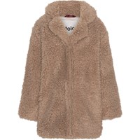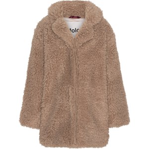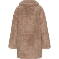 Lichtbruine jas van zacht imitatiebont met kraag, drukknopen en twee zijzakken.