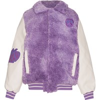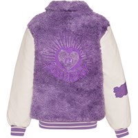 Baseballjas met een voor- en achterkant van paarse imitatiebont en mouwen van wit imitatieleer. De jas heeft decoratieve borduursels op de borst, mouw en rug. Hij heeft een verborgen knoopsluiting langs de voorkant, een overhemdkraag, schuine zakken aan beide zijden en gestreepte ribafwerking bij de armsgaten en onderkant.