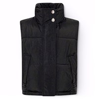 Gevoerde zwarte bodywarmer van gerecycled nylon. De bodywarmer heeft een opstaande kraag en een rits met een flap. Het heeft ook grote armsgaten, waardoor er een jas of een dikke trui onder gedragen kan worden. De bodywarmer heeft voorzakken en een verstelbare elastiek aan de onderkant. De stof is waterafstotend en vrij van PFOS en PFOA.
