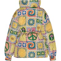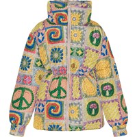 Waterafstotende jas met kleurrijke allover print van gehaakte lapjes. De jas heeft een hoge kraag met verborgen afneembare capuchon, rits langs de voorkant, zakken aan de zijkanten, elastische armsgaten en elastiek in de taille, zodat de silhouet en pasvorm van de jas kunnen worden aangepast. Er is een water- en vuilafstotende coating gebruikt zonder het gebruik van chemicaliën zoals PFOS, PFOA en dergelijke.