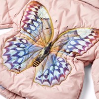 Waterafstotende roze jas van gerecycled polyester met een mooie print van een vlinder op de rug. De jas heeft een opstaande kraag met een geïntegreerde capuchon en een ritssluiting aan de voorkant. Het heeft zijzakken en een verstelbare elastische tailleband aan de binnenkant, voor een getailleerde look wat ook helpt om warmte vast te houden. De jas is gevoerd met parelvulling, een gerecyclede polyester vulling die zorgt voor een constante zachtheid, optimale warmte en gemakkelijk onderhoud bij het wassen. De waterafstotende oppervlakte van de jas is vrij van PFOS en PFOA.