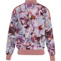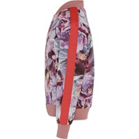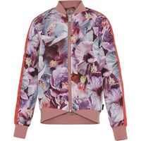 Hanna is een gebloemde jas met rode strepen langs de mouwen. Het heeft een brede roze ribboord rond de hals, mouwen en onderkant.