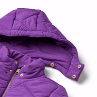 Waterafstotende paarse gewatteerde jas van gerecycled polyester, met een gevulde voering. De jas heeft een knielengte en een afneembare capuchon, een opstaande kraag, een rits met kinbeschermer aan de voorkant en zijzakken. Het heeft geribbelde boorden die sneeuw, regen en wind buiten houden. Het waterafstotende oppervlak van de jas is vrij van PFOS en PFOA.