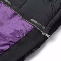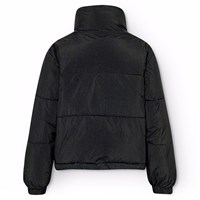 Waterafstotende zwarte jas van gerecycled nylon. De jas heeft een hoge kraag met een geïntegreerde capuchon, een rits met een flap om sneeuw, wind en water buiten te houden. Hij heeft ook voorzakken en elastische manchetten om de wind buiten te houden en warmte vast te houden. De jas is gevoerd met parel padding, een gerecyclede polyester vulling die zorgt voor een constante zachtheid, optimale warmte en gemakkelijk onderhoud bij het wassen. De waterafstotende oppervlakte van de jas is vrij van PFOS en PFOA.