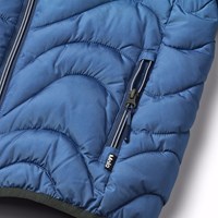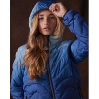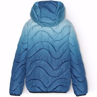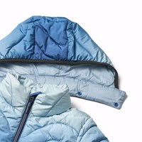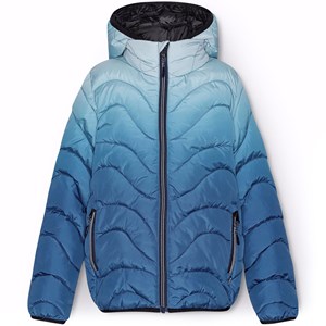 Waterafstotende gewatteerde jas in verschillende blauwe tinten. De kleuren beginnen met een lichtblauwe tint bij de capuchon en worden geleidelijk dieper en donkerder blauw naar beneden toe. De jas heeft een afneembare capuchon, een opstaande kraag, een rits met kinbeschermer en ritszakken aan de voorkant. De Jas en vulling zijn van gerecycled polyester. Het waterafstotende oppervlak is vrij van PFOS en PFOA.