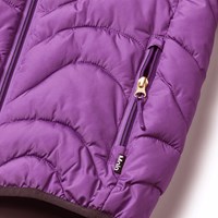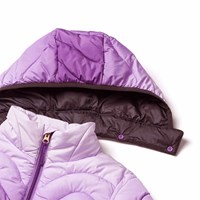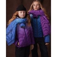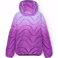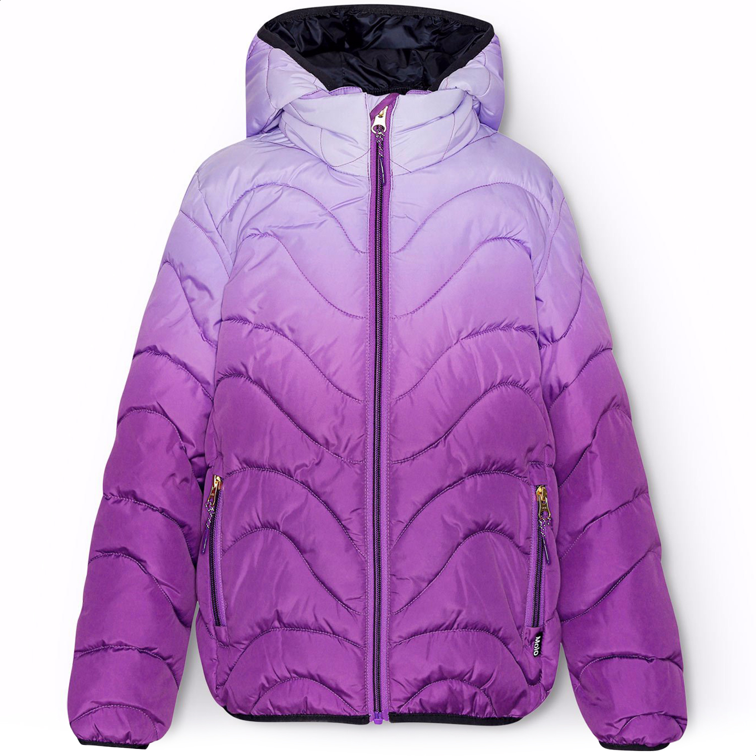 Waterafstotende gewatteerde jas in verschillende paarse tinten. De kleuren beginnen met een lichtpaarse tint bij de capuchon en worden geleidelijk dieper en donkerder paars naar beneden toe. De jas heeft een afneembare capuchon, een opstaande kraag, een rits met kinbeschermer en ritszakken aan de voorkant. De Jas en vulling zijn van gerecycled polyester. Het waterafstotende oppervlak is vrij van PFOS en PFOA.