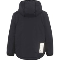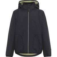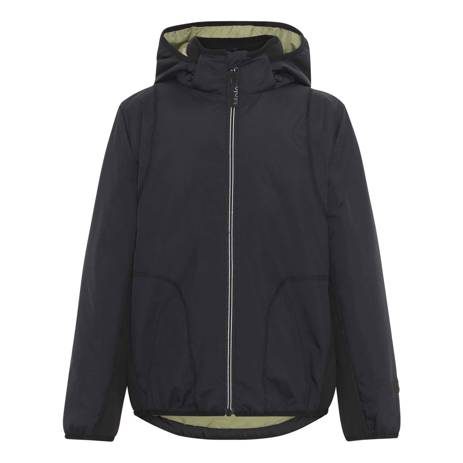 Licht gevoerde windstopper in zwarte parachutestof die is gemaakt van 100% gerecycled polyester van plastic flessen. De zwarte contrasten van de jas zijn gemaakt van softshell en de achterkant van de jas is gemaakt van fleece dat ook is gemaakt van gerecycled polyester. De jas heeft een afneembare capuchon, twee zakken aan de voorkant, een reflector op de achterkant en een verstelbare onderkant. Het is ultrazacht en omdat het licht van gewicht is, kan het worden opgerold en in de capuchon worden gestopt, waardoor het gemakkelijk in te pakken is, bijvoorbeeld in een schooltas.