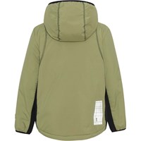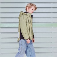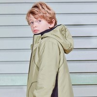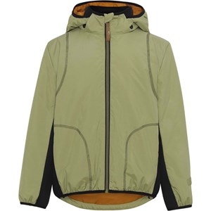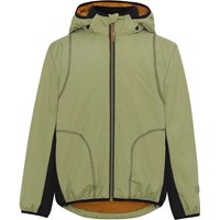 Licht gevoerde windstopper in groene parachutestof die is gemaakt van 100% gerecycled polyester van plastic flessen. De zwarte contrasten van de jas zijn gemaakt van softshell en de achterkant van de jas is gemaakt van fleece dat ook is gemaakt van gerecycled polyester. De jas heeft een afneembare capuchon, twee zakken aan de voorkant, een reflector op de achterkant en een verstelbare onderkant. Het is ultrazacht en omdat het licht van gewicht is, kan het worden opgerold en in de capuchon worden gestopt, waardoor het gemakkelijk in te pakken is, bijvoorbeeld in een schooltas.