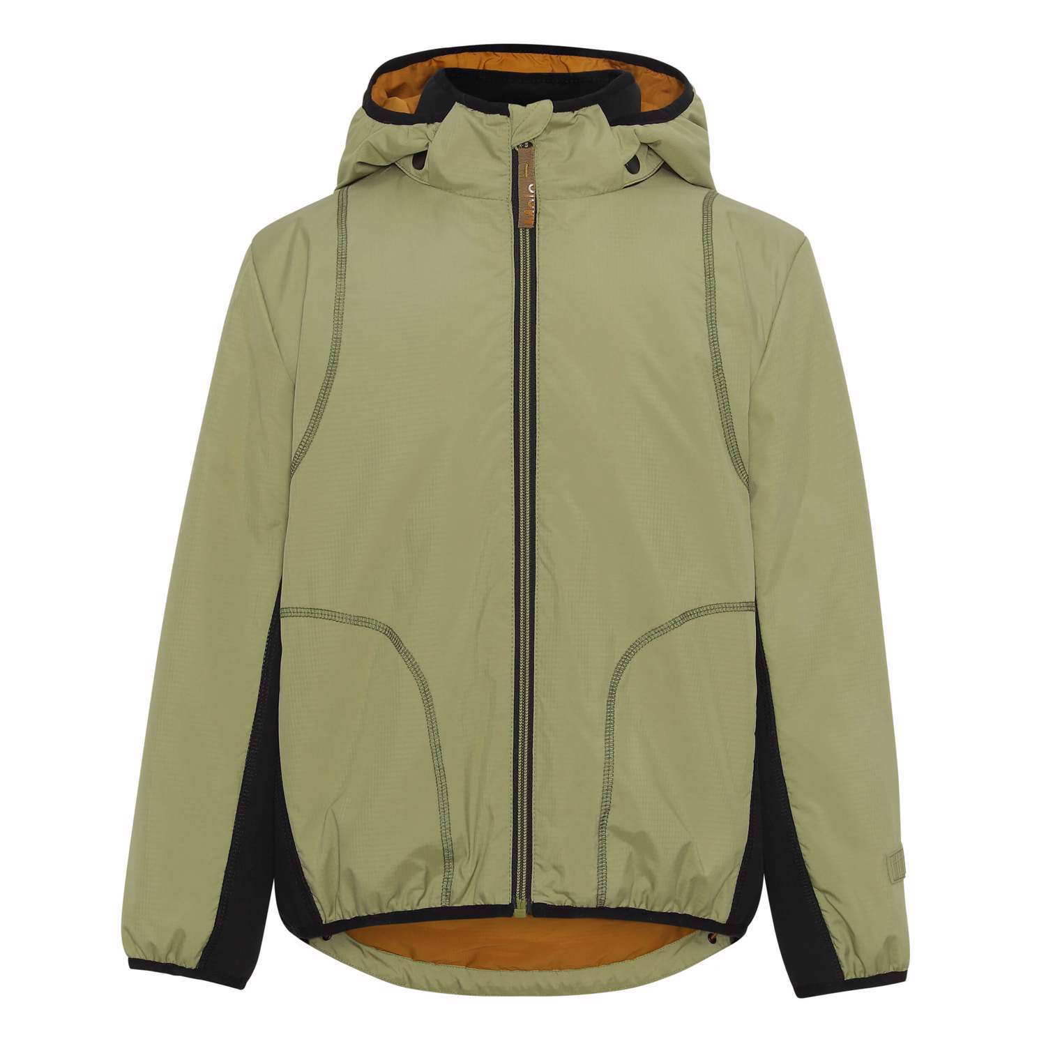 Licht gevoerde windstopper in groene parachutestof die is gemaakt van 100% gerecycled polyester van plastic flessen. De zwarte contrasten van de jas zijn gemaakt van softshell en de achterkant van de jas is gemaakt van fleece dat ook is gemaakt van gerecycled polyester. De jas heeft een afneembare capuchon, twee zakken aan de voorkant, een reflector op de achterkant en een verstelbare onderkant. Het is ultrazacht en omdat het licht van gewicht is, kan het worden opgerold en in de capuchon worden gestopt, waardoor het gemakkelijk in te pakken is, bijvoorbeeld in een schooltas.