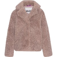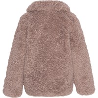 Roze jas van zacht imitatiebont met een korte pasvorm. De jas heeft een kraag, drukknopen en twee zijzakken.