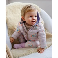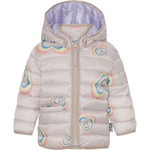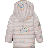 Roze donsjas voor peuters met een hartjesprint. De jas heeft een afneembare capuchon, een opstaande kraag en een rits met kinbeschermer, samen met een eenvoudige zak aan de voorkant. De jas is gevoerd met imitatie dons genaamd Pearl Padding, wat zorgt voor gelijkmatige zachtheid, goede isolatie en gemakkelijk wassen mogelijk maakt. Er is een water- en vuilafstotende coating gebruikt zonder het gebruik van chemicaliën zoals PFOS, PFOA en dergelijke.