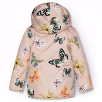 Waterafstotende roze pufferjas voor baby's en peuters, met een zachtroze voering en boorden. De jas heeft een afneembare capuchon, opstaande kraag, rits met kinbeschermer en een enkele zak aan de voorkant. De jas heeft een all-over print van vlinders in verschillende kleuren en patronen. De jas en de vulling zijn van gerecycled polyester. Het waterafstotende oppervlak is vrij van PFOS en PFOA.