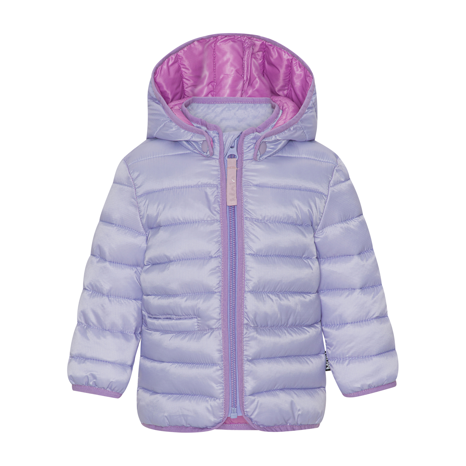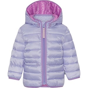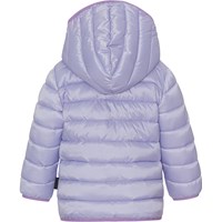 Lichtpaarse donsjas voor peuters met een roze binnenzijde en randen. De jas heeft een afneembare capuchon, een opstaande kraag en een rits met kinbeschermer, samen met een eenvoudige zak aan de voorkant. De jas is gevoerd met imitatie dons genaamd Pearl Padding, wat zorgt voor gelijkmatige zachtheid, goede isolatie en gemakkelijk wassen mogelijk maakt. Er is een water- en vuilafstotende coating gebruikt zonder het gebruik van chemicaliën zoals PFOS, PFOA en dergelijke.