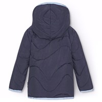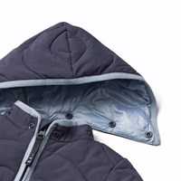 Waterafstotende donkerblauwe gewatteerde jas voor baby's en peuters met een lichtblauwe voering en afwerking. De jas heeft een afneembare capuchon, opstaande kraag, rits met kinbeschermer en een enkele zak aan de voorkant. De jas is van gerecycled nylon en de vulling is van gerecycled polyester. Combineer het met de bijpassende broek en krijg een warme en zachte thermoset.