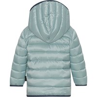 Lichtblauwe donsjas voor peuters met een donkerblauwe binnenzijde en randen. De jas heeft een afneembare capuchon, een opstaande kraag en een rits met kinbeschermer, samen met een eenvoudige zak aan de voorkant. De jas is gevoerd met imitatie dons genaamd Pearl Padding, wat zorgt voor gelijkmatige zachtheid, goede isolatie en gemakkelijk wassen mogelijk maakt. Er is een water- en vuilafstotende coating gebruikt zonder het gebruik van chemicaliën zoals PFOS, PFOA en dergelijke.