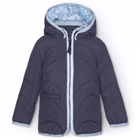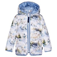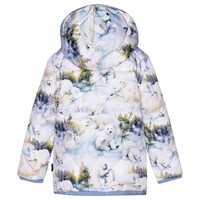 Waterafstotende gewatteerde jas voor baby's en peuters met een lichtblauwe voering en afwerking. De jas heeft een afneembare capuchon, opstaande kraag, rits met kinbeschermer en een enkele zak aan de voorkant. De jas heeft een all-over print van een besneeuwde landschap met speelse ijsberen. De jas en de vulling zijn van gerecycled polyester. Het waterafstotende oppervlak is vrij van PFOS en PFOA.