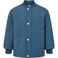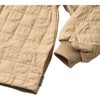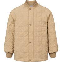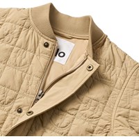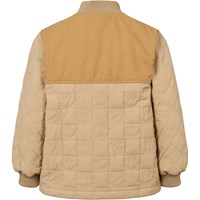 Zandkleurige gewatteerde katoenen jas met zachte ribbels bij de hals en manchetten. De jas heeft een wind- en waterafstotend oppervlak, sluit met een rits en drukknopen aan de voorkant, en is doorgestikt met kleine smileys in de naden. Het achterpand is gemaakt van een contrasterend gekleurde canvas. Een warme en comfortabele jas voor koele dagen.