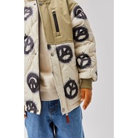 Harold is een beige gewatteerde jas met een peace print. Het heeft ribboorden rond de hals en mouwen en een ritssluiting. De jas is ook waterafstotend en PFC-vrij.