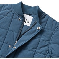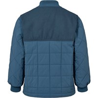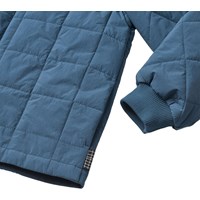 Blauwe gewatteerde katoenen jas met zachte ribboorden bij de hals en manchetten. De jas heeft een wind- en waterafstotend oppervlak, sluit met een rits en drukknopen aan de voorkant, en is gewatteerd. Het achterpand is gemaakt van een contrasterend gekleurde canvas. Een warme en comfortabele jas voor koele dagen.