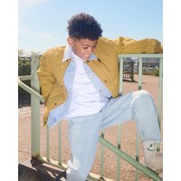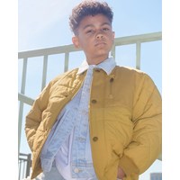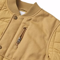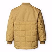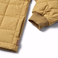 Kakikleurige, doorgestikte, waterafstotend thermisch jas van gerecycled nylon met canvasdetails en een borstzak met ritssluiting. De jas heeft een normale pasvorm, steekzakken, ritssluiting met windflap en ribboorden rond de nek en mouwen, die beschermen tegen de wind.