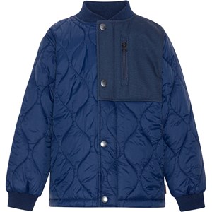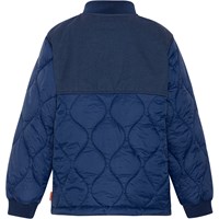 Donkerblauwe doorgestikte waterafstotende jas met decoratieve canvaspanelen op de linkerborst en bovenaan de achterkant. De jas heeft een borstzak, discrete zijzakken, ribboord rond de hals en mouwen en een verborgen ritssluiting aan de voorkant met windflap en drukknopen. De jas is behandeld met een water- en vuilafstotende coating die geen chemicaliën bevat zoals PFOS, PFOA etc.