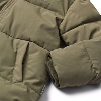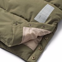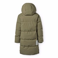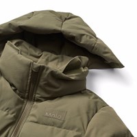Wind- en waterafstotende donkergroene jas gemaakt van gerecycled nylon met ritssluiting, hoge kraag en afneembare capuchon. De jas heeft een lengte boven de knie en is ontworpen met voorzakken, een binnenzak en ribboorden rond de mouwen. Hoge splitten met drukknopen aan beide zijden zorgen voor veel bewegingsvrijheid en maken de jas praktisch voor fietsen. Een grote reflector op de achterkant verhoogt de zichtbaarheid in het verkeer. De jas is gevoerd met zachte, gerecyclede polyester vulling voor comfort en optimale warmte-isolatie.