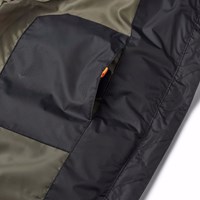 Zwarte gewatteerde jas van gerecycled polyester voor een koude winter. De jas reikt tot over de knie, heeft een afneembare capuchon, zijzakken en mouwen met geribbelde manchetten, die effectief wind, sneeuw en regen buiten houden en ervoor zorgen dat handschoenen op hun plaats blijven. Hij is uitgerust met hoge splitten aan beide zijden, die met drukknopen kunnen worden gesloten, waardoor er veel bewegingsvrijheid is en het gemakkelijk is om in de jas te fietsen. De jas heeft een grote reflector op de achterkant om de zichtbaarheid in het verkeer te vergroten.