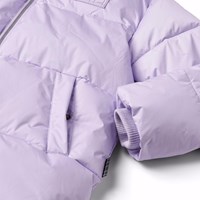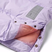 Lichtpaarse gewatteerde jas van gerecycled polyester voor een koude winter. De jas reikt tot over de knie, heeft een afneembare capuchon, zijzakken en mouwen met geribbelde manchetten, die effectief wind, sneeuw en regen buiten houden en ervoor zorgen dat handschoenen op hun plaats blijven. Het is uitgerust met hoge splitten aan beide zijden, die met drukknopen kunnen worden gesloten, waardoor er veel bewegingsvrijheid is en het gemakkelijk is om in de jas te fietsen. De jas heeft een grote reflector op de achterkant om de zichtbaarheid in het verkeer te vergroten.