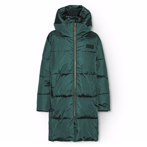 Zeegroene gewatteerde jas van gerecycled polyester voor een koude winter. De jas reikt tot over de knie, heeft een afneembare capuchon, zijzakken en mouwen met geribbelde manchetten, die effectief wind, sneeuw en regen buiten houden en ervoor zorgen dat handschoenen op hun plaats blijven. Het is uitgerust met hoge splitten aan beide zijden, die met drukknopen kunnen worden gesloten, waardoor er veel bewegingsvrijheid is en het gemakkelijk is om in de jas te fietsen. De jas heeft een grote reflector op de achterkant om de zichtbaarheid in het verkeer te vergroten.