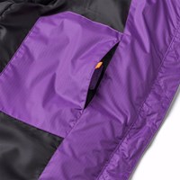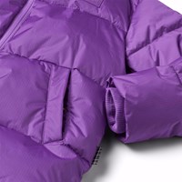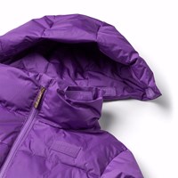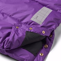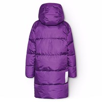 Paarse gewatteerde jas van gerecycled polyester voor een koude winter. De jas reikt tot over de knie, heeft een afneembare capuchon, zijzakken en mouwen met geribbelde manchetten, die effectief wind, sneeuw en regen buiten houden en ervoor zorgen dat handschoenen op hun plaats blijven. Het is uitgerust met hoge splitten aan beide zijden, die met drukknopen kunnen worden gesloten, waardoor er veel bewegingsvrijheid is en het gemakkelijk is om in de jas te fietsen. De jas heeft een grote reflector op de achterkant om de zichtbaarheid in het verkeer te vergroten.