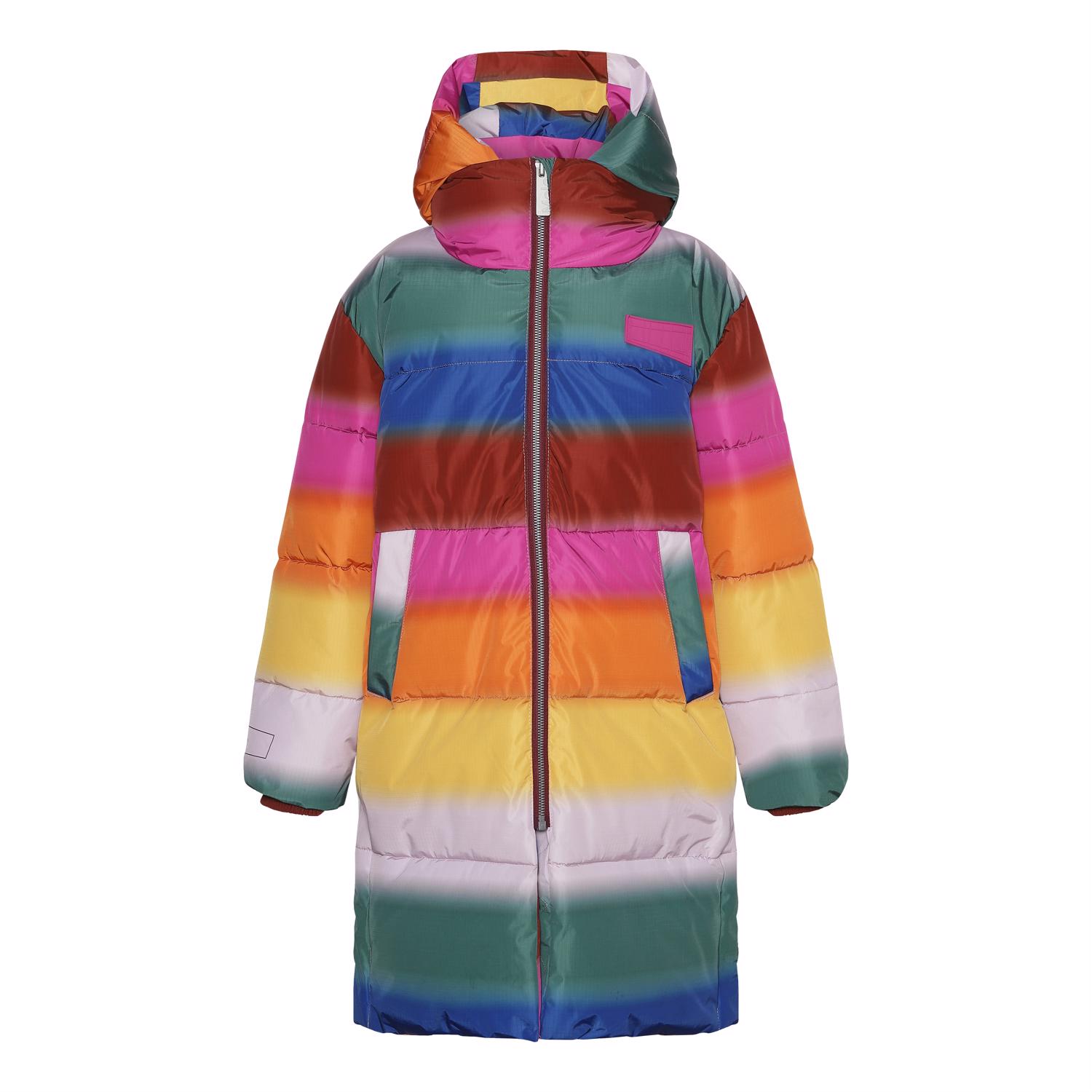 Harper is een heerlijk warme lange jas in een regenboogprint. De buitenstof is 51% gerecycled en de voering en tussenvoering zijn 100% gerecycled van gerecycled polyester. Het heeft een capuchon, ritszakken aan de voorkant en een reflector aan de achterkant. De jas is gevoerd met pearl padding, waardoor het extra zacht is, warmte vasthoudt en een donsachtig gevoel geeft. De buitenstof heeft een waterafstotende, PFC-vrije oppervlaktebehandeling (bevat bijvoorbeeld geen PFOS, PFOA, enz.).