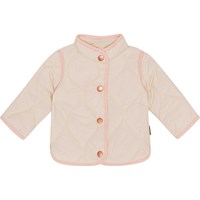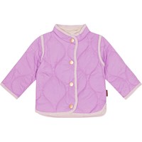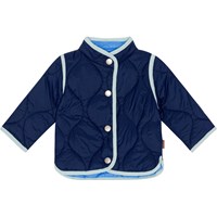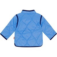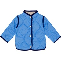 Blauwe doorgestikte jasje voor kleine kinderen met een donkerblauwe boord en drukknopen aan de voorkant. Het is behandeld met een water- en vuilafstotende coating die geen chemicaliën zoals PFOS, PFOA etc. bevat.
