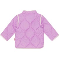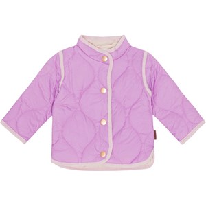 Paarse doorgestikte jasje voor kleine kinderen met een lichtroze boord en drukknopen aan de voorkant. Het is behandeld met een water- en vuilafstotende coating die geen chemicaliën zoals PFOS, PFOA etc. bevat.
