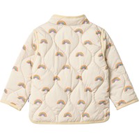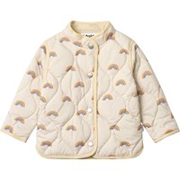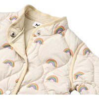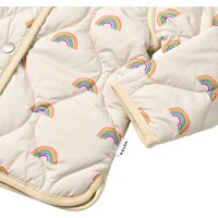 Beige waterafstotende thermojas gemaakt van gerecycled polyester met een gewatteerd patroon en een print van kleine regenbogen. De jas heeft een normale pasvorm, een opstaande kraag, drukknopen aan de voorkant en bijpassende bies, wat een mooie afwerking geeft.