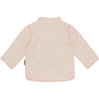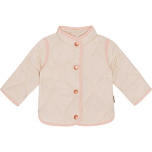 Beige doorgestikte jasje voor kleine kinderen met een lichtroze boord en drukknopen aan de voorkant. Het is behandeld met een water- en vuilafstotende coating die geen chemicaliën zoals PFOS, PFOA etc. bevat.