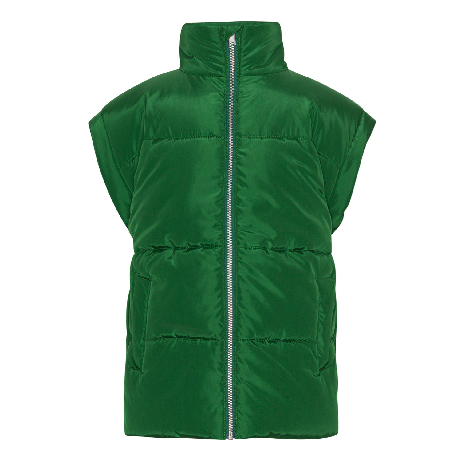 Groene, waterafstotende gewatteerde bodywarmer in een praktische lengte met brede armsgaten, hoge kraag, rits aan de voorkant en zakken aan beide zijden. Bij de taille is er een verstelbare elastiek om de silhouet en pasvorm aan te passen. Er is een water- en vuilafstotende coating gebruikt, zonder het gebruik van chemicaliën zoals PFOS, PFOA en dergelijke.
