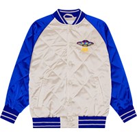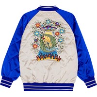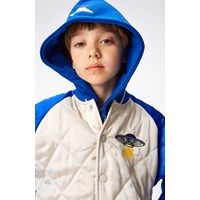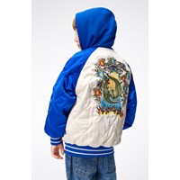 Doorgestikte bomberjack in blauw en gebroken wit met een grote geborduurde print. Het heeft gestreepte ribboorden aan de hals, mouwen en onderkant en heeft drukknopen aan de voorkant. De jas heeft een stoere geborduurde print van een UFO, een dinosaurus en vuur, wat de jas een stoere uitstraling geeft.